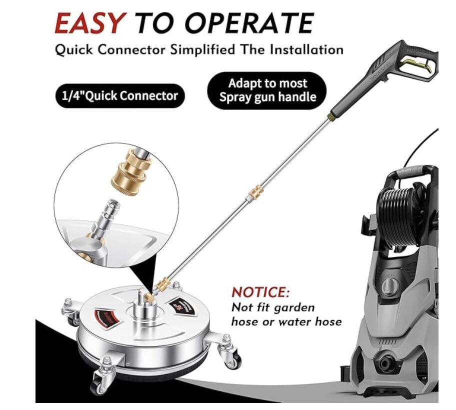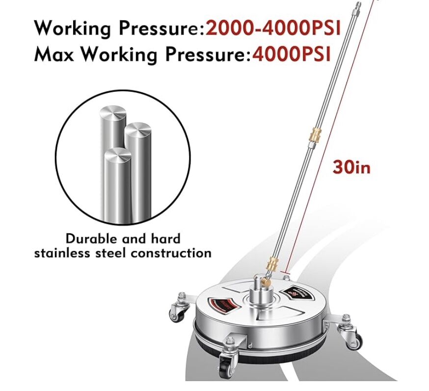 HIGH EFFICIENCY AND PERFECT DESIGN – This driveway pressure washer attachment features stainless steel construction on heavy duty jobs, simply steer this washer across the sidewalk or driveway and it erases the mildew, dirt and mold from its surface, did not use any chemicals just water, improve your pressure washing experience. More power will be better cleaning, suggest using 2500 psi pressure washer or above.