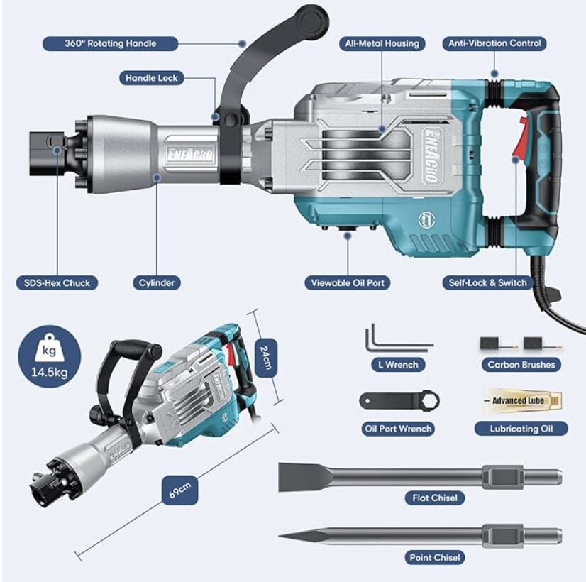 Comprehensive Tool Kit for Versatile Applications The package includes everything you need for a wide range of demolition tasks: a powerful demolition hammer, a pointed chisel, a flat chisel, spare carbon brushes, a tube of lubricant, an oil bottle wrench, and two hex wrenches. This complete set of accessories ensures that you’re fully equipped for various jobs right out of the box, eliminating the need for additional purchases and providing exceptional value.