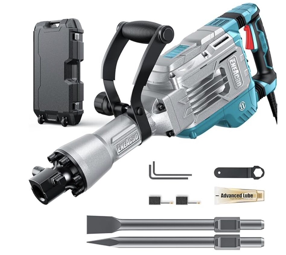 High Power and Exceptional Demolition Efficiency Featuring a robust 1700W motor that delivers an impressive 48 ft/lbs (65 joules) of impact energy, ENEACRO heavy-duty demolition hammer is designed for demanding tasks such as home renovations, wall and floor demolition, and road surface breaking. It provides fast, effective results, saving you time and effort on intensive jobs. Built with premium aluminum materials, this jackhammer is engineered for durability and long-term use, capable of withstanding heavy daily use in rugged environments. Rent today for your next project at Kings Rental Club.