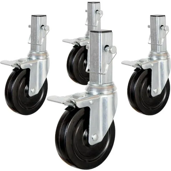 Our 8-inch Heavy Duty Caster Wheel with Double-Lock Pins is a sturdy, safe, and reliable scaffolding wheel designed to be used with scaffolding frames. These heavy-duty wheels are also usable on most other standard scaffolding frames. Rent today to make quick work of your scaffolding project. They’re built from industrial-strength polyurethane and mounted on cast-iron hubs with grease-fitting adapters for easy maintenance. Each wheel can support a total weight of 550 pounds and is built primarily for use on concrete floors. Each attachable wheel can be affixed to exterior standard scaffolds or arch frames. These 8-inch polyurethane caster wheels can help significantly reduce job task completion hours thanks to their stability and smooth mobility, letting you move your standard scaffolding to new locations to continue the work. The 8-inch caster can be especially helpful on larger scaffolds where they need to bear the weight of two or three levels’ worth of scaffolding equipment, tools, and materials. The double-lock mechanism on the wheel helps increase the stability of the scaffolding and adds a layer of safety to the work. Our scaffolding wheels meet OSHA standards of safety. Built and designs practical, effective, efficient, and safe work equipment for office and home use. We strive to incorporate new technology and innovation into equipment and accessories that make sense, so you can get jobs done easily, safely, and on time. Rent today at Kings Rental Club.