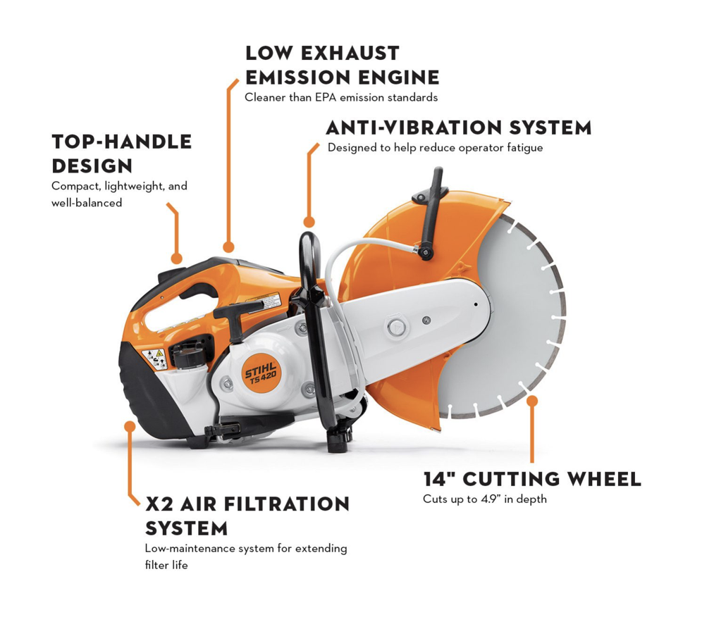 Stihl TS 700 Concrete Saw 14 in Blade Dia. ( Blade NOT Included ), Wet/Dry, 4 in Max Cutting Depth, 4,700 RPM Max. Blade Speed- Rental